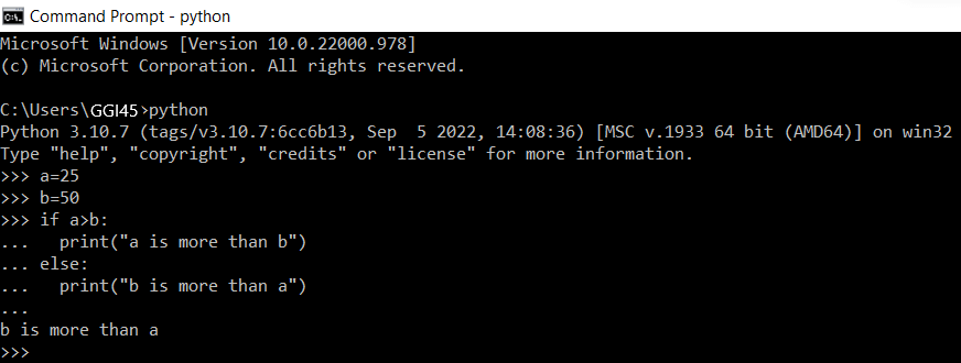 ... print ("b is more than a")