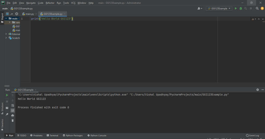 Let us take an example of executing a Python script in PyCharm IDE: