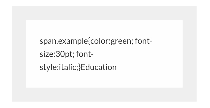 The first line 1 opens the <style> element. The next line begins our style rule. A style rule has two parts: the selector, which indicates which element(s) the style applies to, and a list of declarations (surrounded by curly braces) which define how the element should be presented. In this case, the selection is h2, which means the following rule applies to all <h2> elements. The selector is followed by an opening curly brace. The list of declarations is nested between the opening and closing curly braces. Note that the white space (line breaks and spaces) between each declaration are just their to make the code more readable and have no effect on how the code works. The declarations say that the font is green, that the font should be 30 points tall, and that the font should be italic. After the final declaration we close ruleset with the closing curly brace, ending the list of declarations. Finally, on the last line we see the closing <style> tag. This rule automatically applies to all <h2> elements. So if we create a header using an <h2> tag:<h2>Education</h2>
