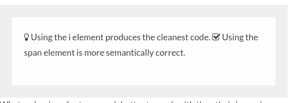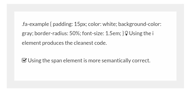Here’s an example of those two steps in action.<head> <!--This link is available at Font Awesome's "Get Started" page--> <link rel="stylesheet" href="https://maxcdn.bootstrapcdn.com/font-awesome/4.5.0/css/font-awesome.min.css"> </head> <body> <p><i class="fa fa-lightbulb-o"></i> Using the i element produces the cleanest code.</p> <p><span class="fa fa-check-square-o"></span> Using the span element is more semantically correct.</p> </body>