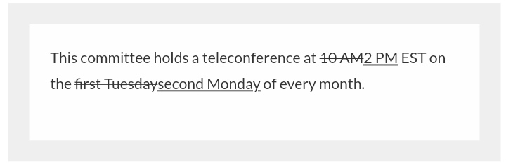 Keep Track of Document Changes If you want a document on the web to display the changes made to it over time you can use the del and ins tags to keep track of the changes. Text wrapped in del tags has been deleted from the document, and text wrapped in ins tags has been inserted into the document. Here’s an example:<p>This committee holds a teleconference at <del>10 AM</del><ins>2 PM</ins> EST on the <del>first Tuesday</del><ins>second Monday</ins> of every month.</p>
