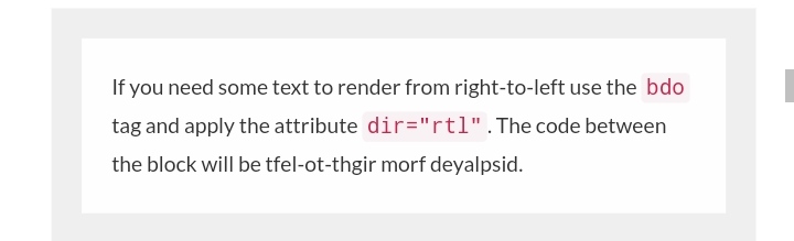 Acknowledging Quotations There are three elements commonly used when dealing with quotations. When quoting a person, book, website, or any other source, the quoted text should be wrapped in q tags if the quotation is inline with the surrounding text. If the quotation is long enough that it occupies a standalone block of text the entire block should be wrapped in blockquote tags. When referencing a work, such as when giving appropriate credit for a quotation, wrap the name of the work in cite tags. For example, if we were to mention the book Responsive Web Design by Ethan Marcotte, the title of the book should be wrapped in cite tags – and it is. Reversing the Direction of Text Some languages, Arabic for example, are read from the right-to-left rather than left-to-right. To display right-to-left text in an otherwise left-to-right oriented document wrap it in bdo tags and use the dir attribute to override the default text behavior.<p>If you need some text to render from right-to-left use the <code>bdo</code> tag and apply the attribute <code>dir="rtl"</code>. The code between the block will be <bdo dir="rtl">displayed from right-to-left</bdo>.</p>