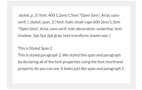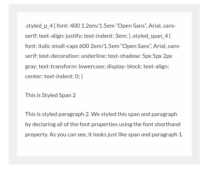 Let’s apply all of these styles to a paragraph of text to see them in action. While we’re at it, we’ll also use Google Fonts to import Open Sans and apply it to our text as well.<!--First, we import Open Sans in both 400 and 600 typeface--> <link href='https://fonts.googleapis.com/css?family=Open+Sans:400,600' rel='stylesheet' type='text/css'> <!--Here is our CSS--> <style> .unstyled_p { font: initial; } .unstyled_span { font: initial; } .styled_p_1 { font-style: normal; font-variant: normal; font-weight: 400; font-size: 1.2em; line-height: 1.5em; font-family: "Open Sans", Arial, sans-serif; } .styled_span_1 { font-style: italic; font-variant: small-caps; font-weight: 600; font-size: 2em; line-height: 1.5em; font-family: "Open Sans", Arial, sans-serif; } .styled_p_2 { font: 400 1.2em/1.5em "Open Sans", Arial, sans-serif; } .styled_span_2 { font: italic small-caps 600 2em/1.5em "Open Sans", Arial, sans-serif; } </style> <p class="unstyled_p"><span class="unstyled_span">This is an Unstyled Span</span> <br>This is an unstyled paragraph. We set all of the font properties to initial to demonstrate the standard styling applied by your web browser. It does not look like our styled spans and paragraphs.</p> <hr> <p class="styled_p_1"><span class="styled_span_1">This is Styled Span 1</span> <br>This is styled paragraph 1. We styled this span and paragraph by declaring each of the font properties seperately. As you can see, it looks just like span and paragraph 2.</p> <hr> <p class="styled_p_2"><span class="styled_span_2">This is Styled Span 2</span> <br>This is styled paragraph 2. We styled this span and paragraph by declaring all of the font properties using the font shorthand property. As you can see, it looks just like span and paragraph 1.</p>