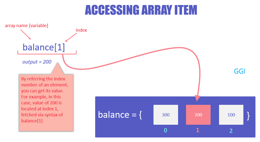 The following image illustrates the basic concept of accessing arrays items by their index.