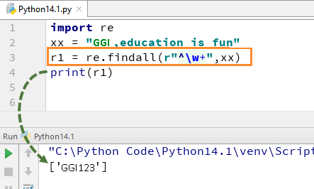 import re xx = "ggi,education is fun" r1 = re.findall(r"^\w+",xx) print(r1)