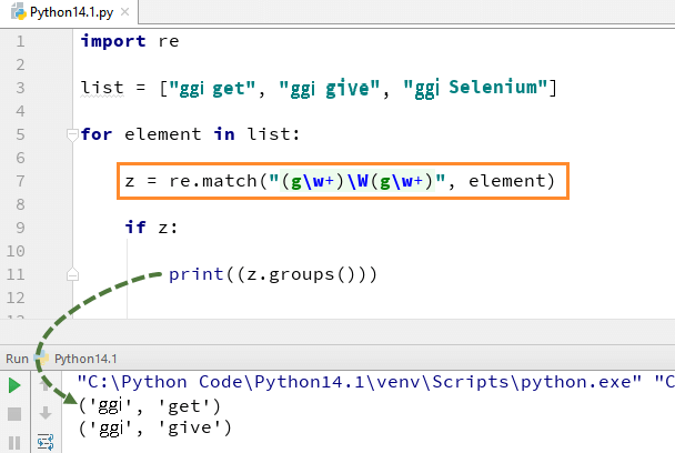 For example, consider the following code of Python re.match() function. The expression “w+” and “\W” will match the words starting with letter ‘g’ and thereafter, anything which is not started with ‘g’ is not identified. To check match for each element in the list or string, we run the forloop in this Python re.match() Example.