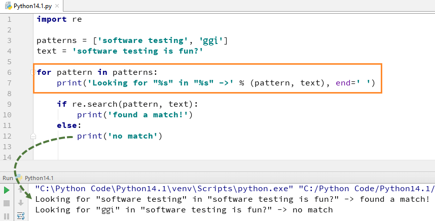 For example here we look for two literal strings “Software testing” “ggi”, in a text string “Software Testing is fun”. For “software testing” we found the match hence it returns the output of Python re.search() Example as “found a match”, while for word “ggi” we could not found in string hence it returns the output as “No match”.
