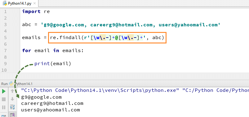 Here we have a list of e-mail addresses, and we want all the e-mail addresses to be fetched out from the list, we use the method re.findall() in Python. It will find all the e-mail addresses from the list.