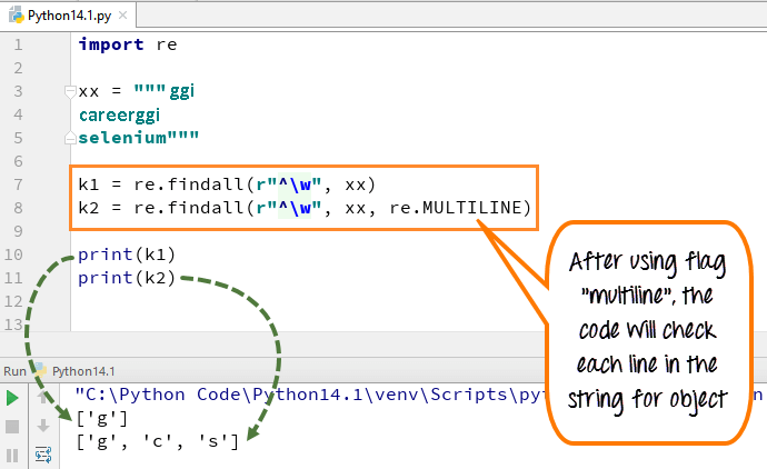 import re xx = """ggi careerggi selenium""" k1 = re.findall(r"^\w", xx) k2 = re.findall(r"^\w", xx, re.MULTILINE) print(k1) print(k2)