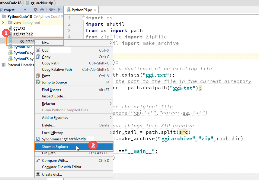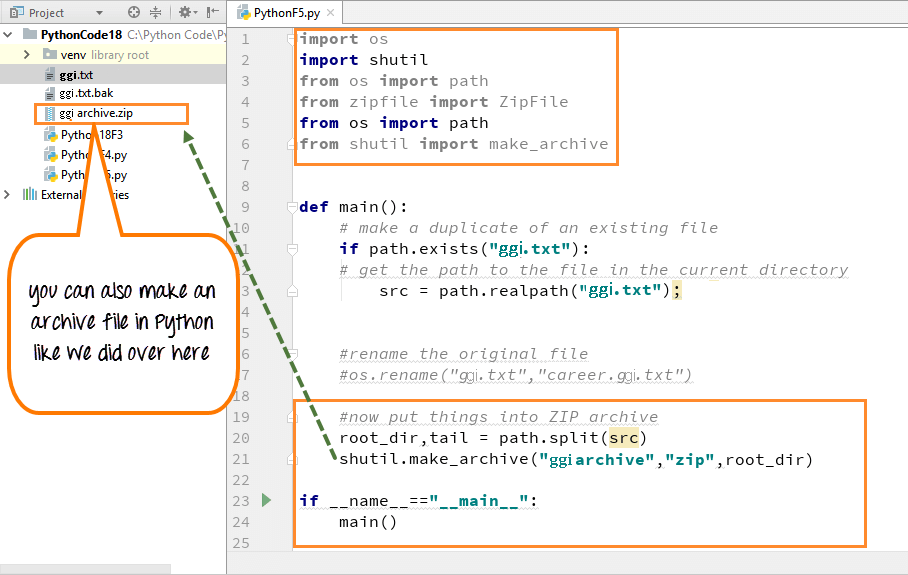 Step 1) To create an archive file from Python, make sure you have your import statement correct and in order. Here the import statement for the archive is from shutil import make_archive
