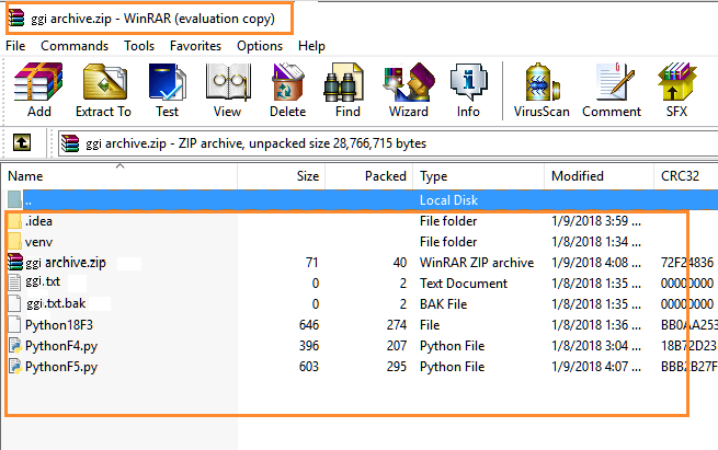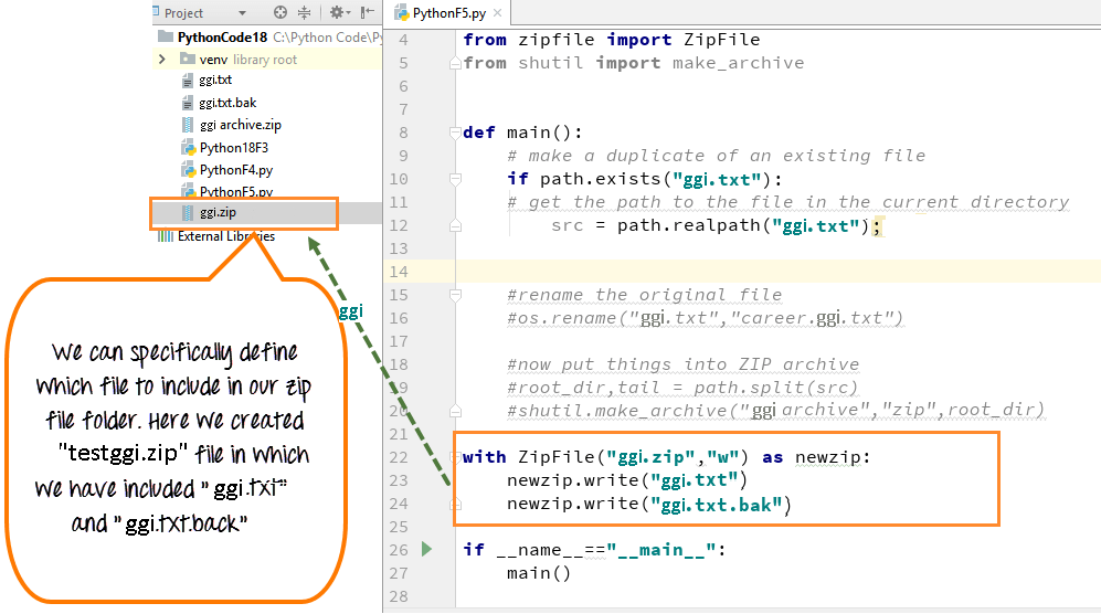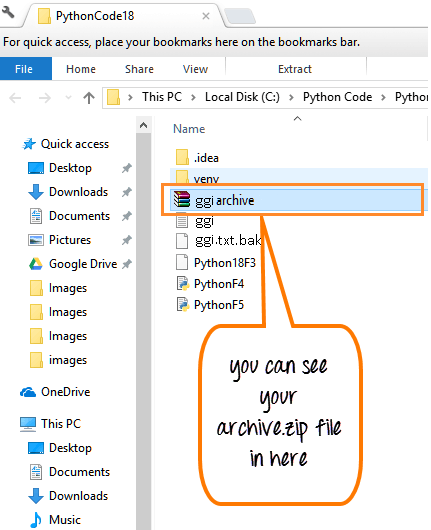 Step 4) In Python we can have more control over archive since we can define which specific file to include under archive. In our case, we will include two files under archive “ggi.txt” and “ggi.txt.bak”.