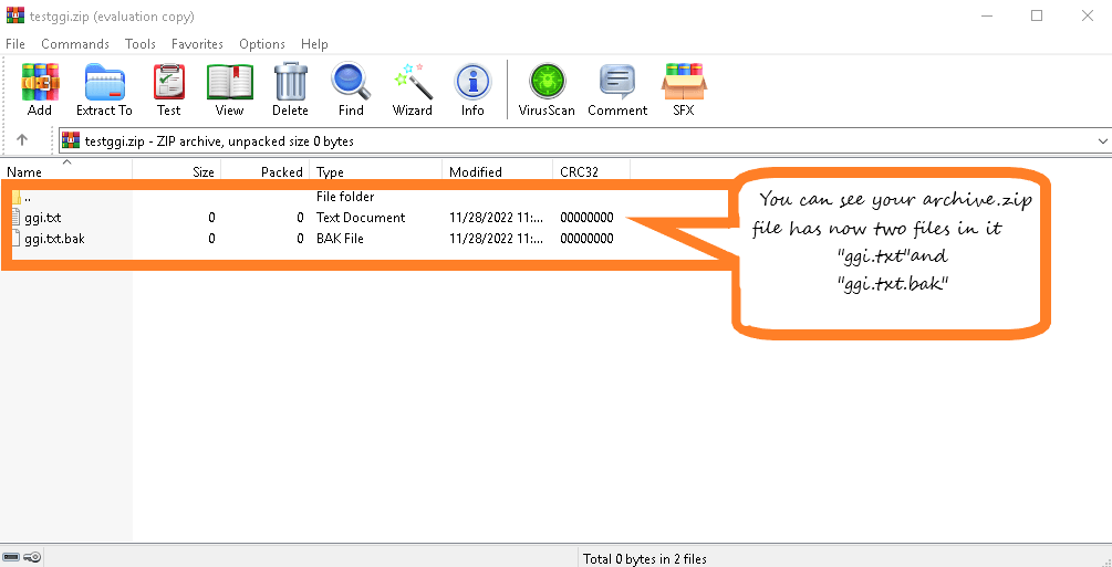 - Using the write function on the “newzip” variable, we add the files “ggi.txt” and “ggi.txt.bak” to the archive